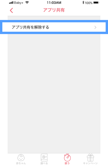 - ママ側のアプリの設定画面から、「アプリ共有」>「アプリ共有を解除する」を選択