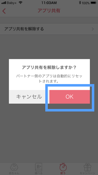 - 「OK」ボタンをタップしてアプリ共有の解除を完了させてください
