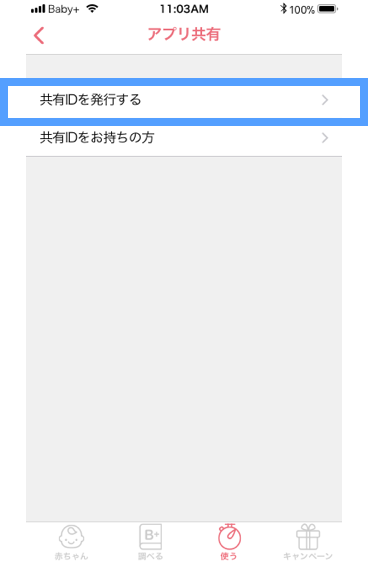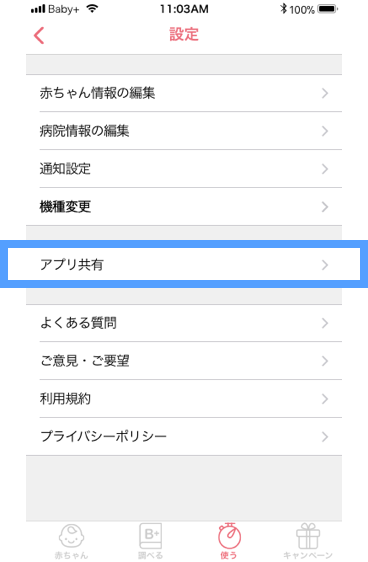 機種変更などで他の端末でBabyプラスアプリを引き続きご利用になりたい場合、ママ側の端末で、アプリ共有の解除の設定をし、再度共有IDを発行してもらう必要があります。