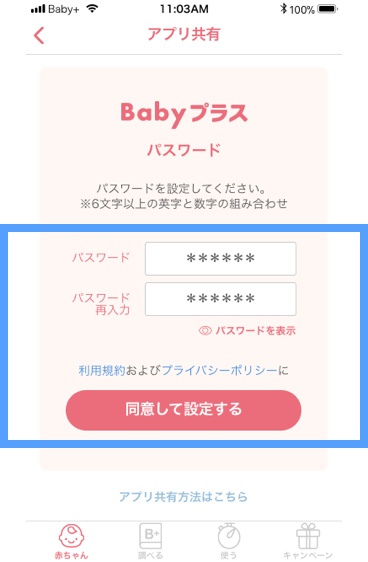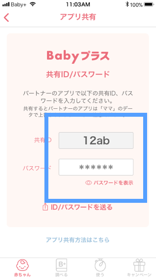 - アプリを利用し始めた後にアプリ共有したい場合は、設定画面>アプリ共有>共有IDをお持ちの方を選択し、共有IDとパスワードを入力してください。