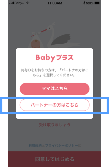 - パートナー側のアプリを起動し、「パートナーの方はこちら」ボタンを選択