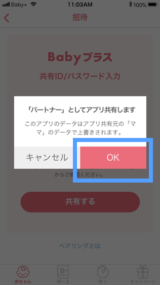- OKボタンをタップすると、ママ側のデータが共有されます